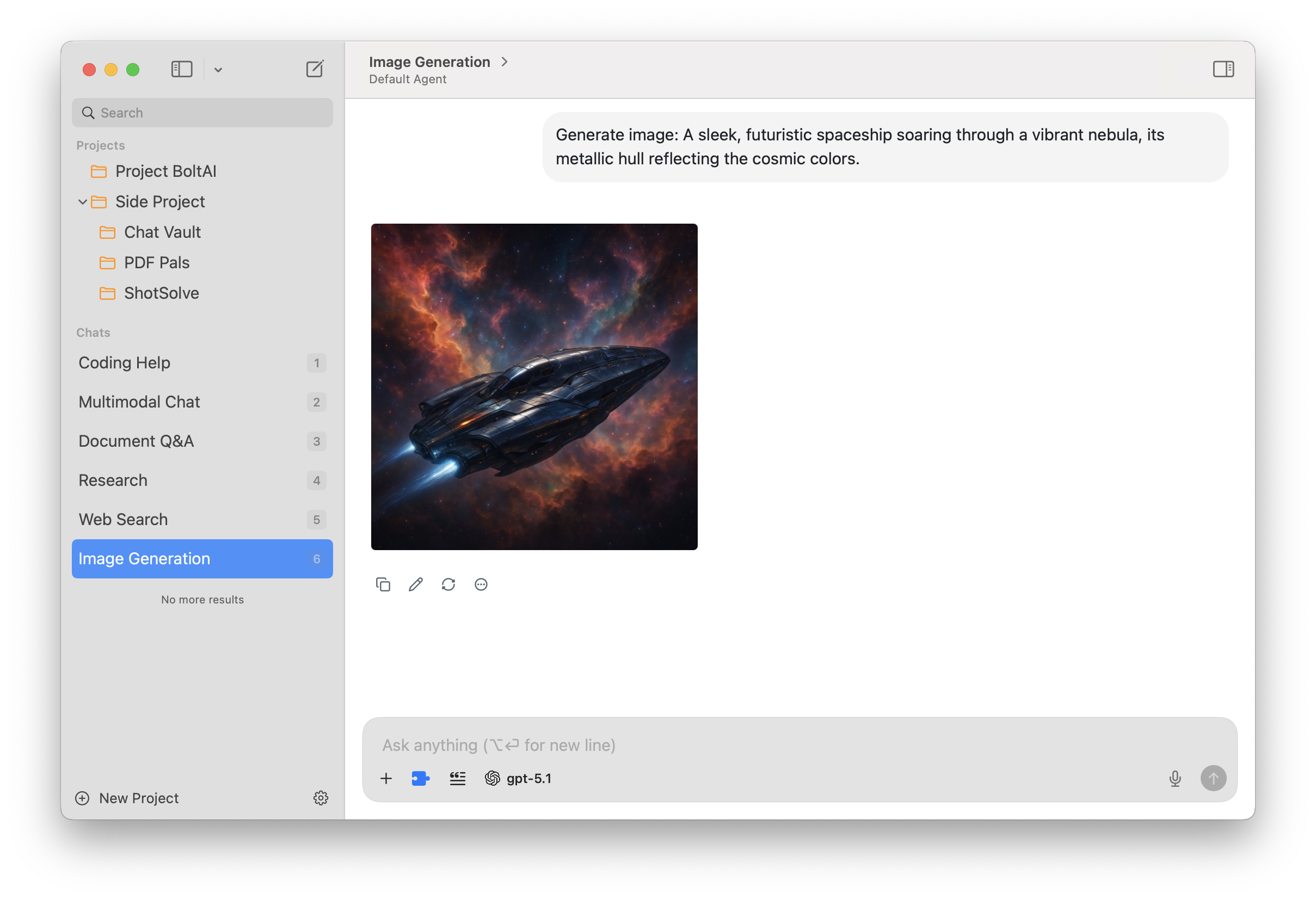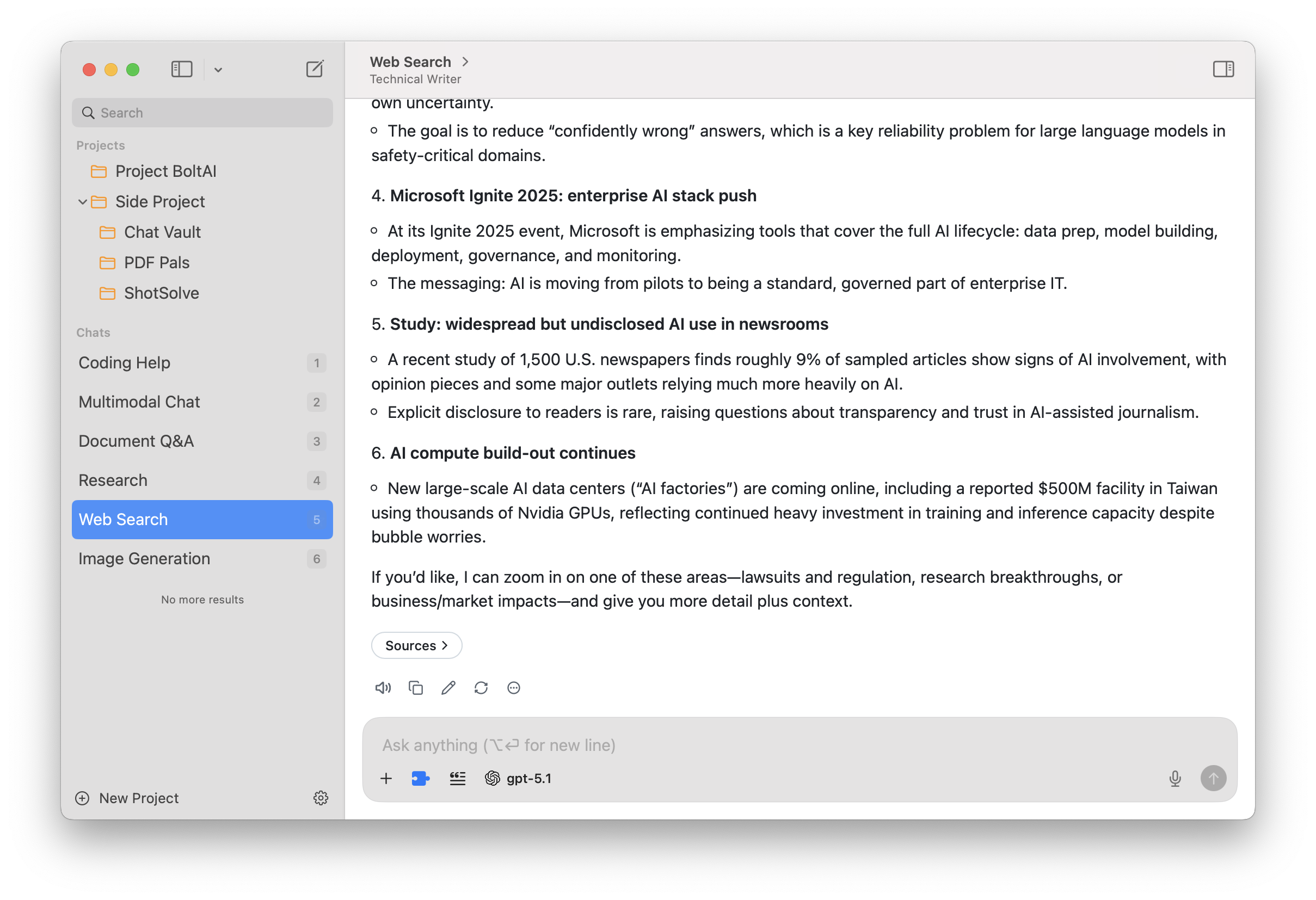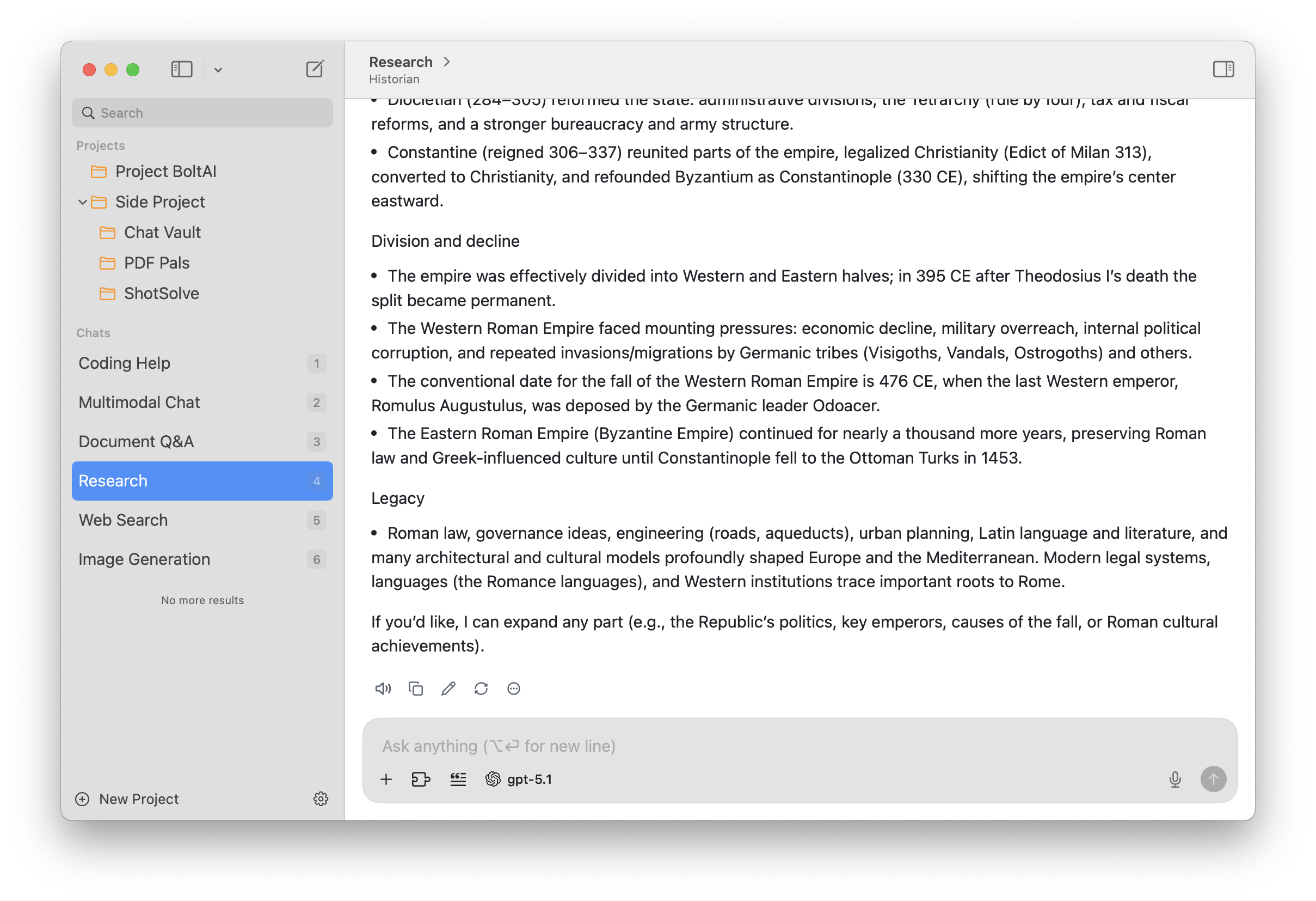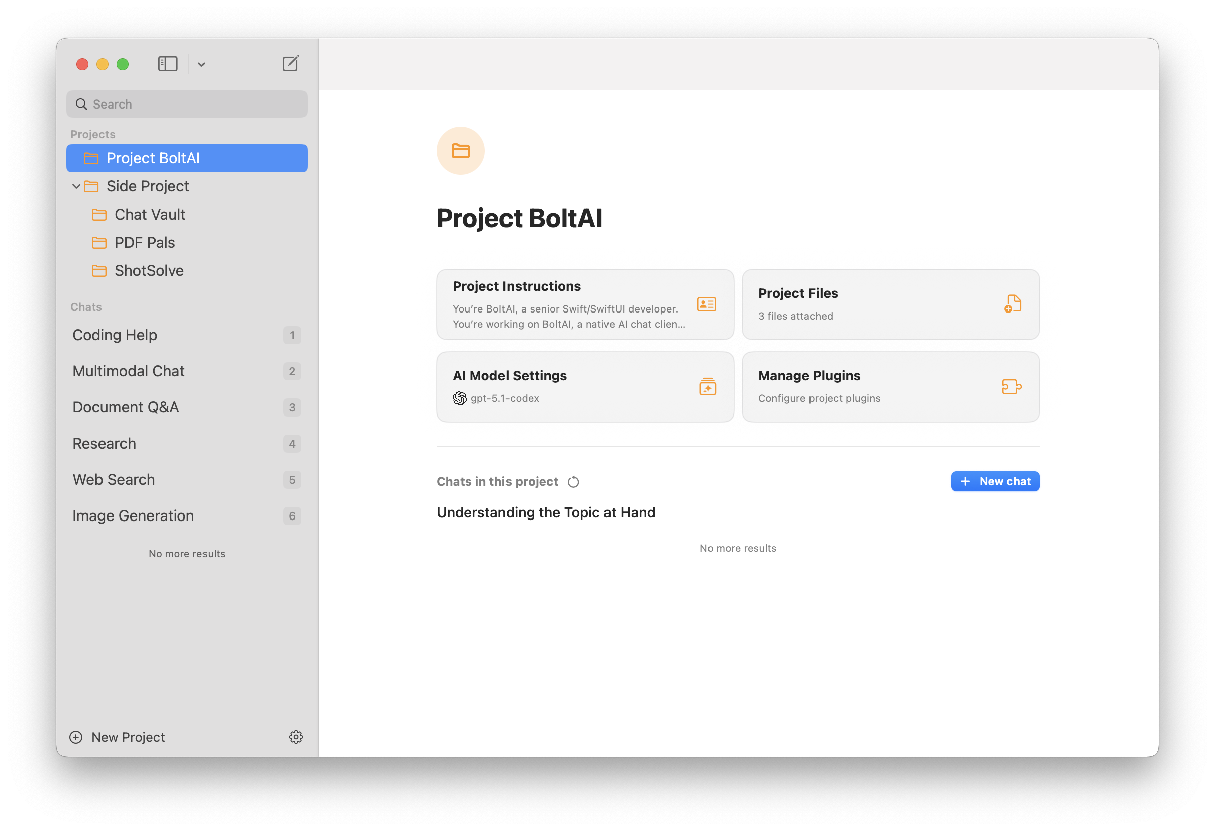 BoltAI brings together pro tools, advanced models, structured workflows, and deep customization — all in a clean, native Mac experience built for speed.