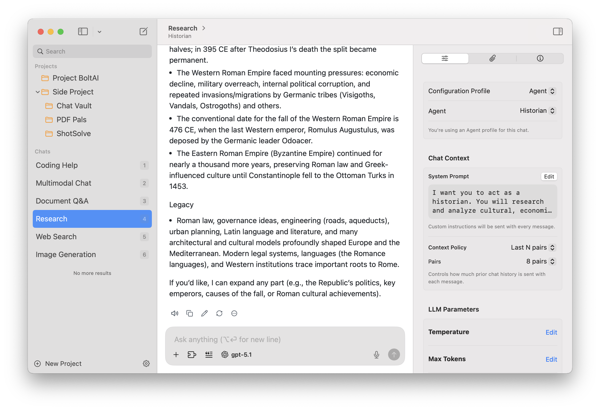- Work with projects, multi-chat threads, forking, and reusable agents to keep everything structured. BoltAI scales from quick prompts to complex long-running workflows.