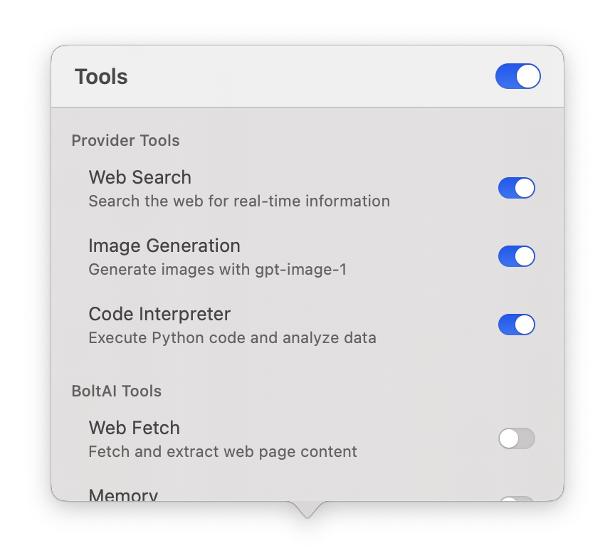 Connect BoltAI to local and remote MCP servers, toggle tools per agent, and keep your AI workflows configurable in code.