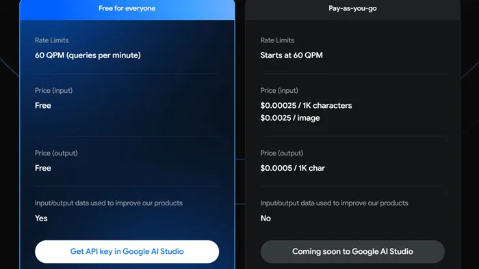 - Free Tier: Allows up to 15 requests per minute, 1,500 requests per day, and 1 million tokens per minute, with free context caching for up to 1 million tokens per hour.